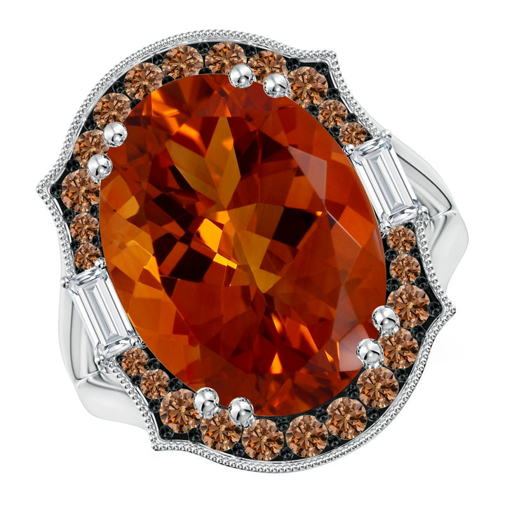 This Vintage-Inspired GIA Certified Oval Citrine Halo Ring by Angara radiates golden brilliance and antique charm. A magnificent oval citrine commands attention with its sun-drenched glow, encircled by a warm halo of coffee diamonds. The intricate vintage styling evokes opulence, while the fiery palette brings warmth, creativity, and abundance to every gesture.