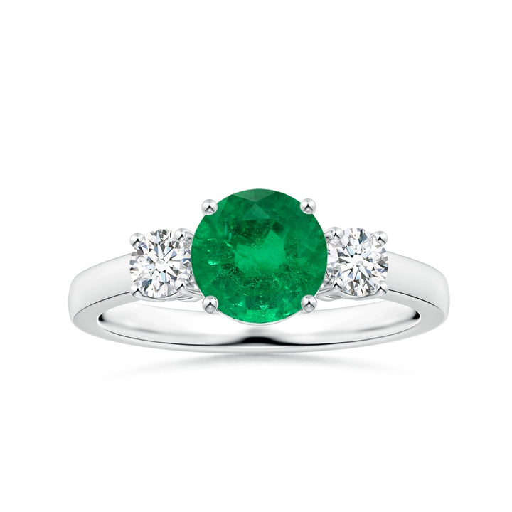 This Three Stone GIA Certified Round Emerald Ring with Diamonds by Angara symbolizes the past, present, and future. A lush green emerald glows between two sparkling diamonds, making it a meaningful and luxurious expression of enduring love.