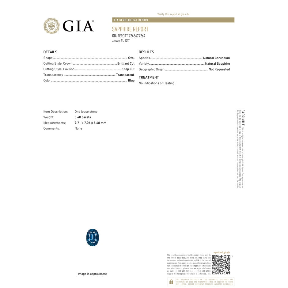 Crafted in 18K white gold with 1 heated oval blue sapphire (9.70×7.06×5.66mm, 3.48 ctw, A quality) and 32 round diamonds (0.62 ctw, G-H VS) in U pave and prong settings. Also available in yellow, rose gold, or platinum.