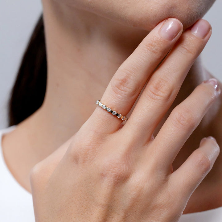 This Prong-Set Diamond Eternity Stackable Ring by Angara is a versatile and luxurious staple. Each diamond is secured in a shared-prong eternity setting, allowing maximum brilliance and a seamless line of sparkle. Perfect worn alone or stacked.