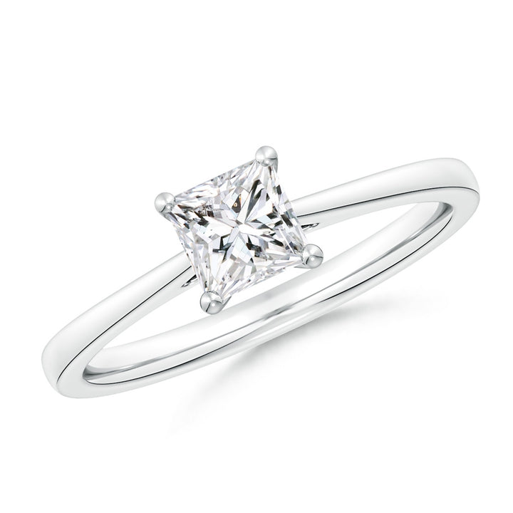 This Princess-Cut Diamond Reverse Tapered Shank Cathedral Engagement Ring by Angara brings a modern touch to classic romance. The solitaire princess-cut diamond, prong set on a 14k white gold reverse tapered shank, sparkles with brilliance while the cathedral setting adds height and elegance, perfect for a memorable proposal.