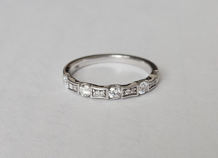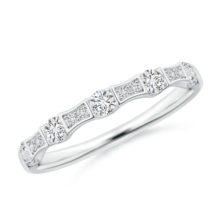 The Bar and Pave-Set Diamond Bow Tie Station Wedding Ring by Angara is a unique and elegant band. Crafted in 18k white gold, the ring features 13 round diamonds set alternately in bar and pave settings, forming a distinctive bow-tie pattern that symbolizes unity and style.