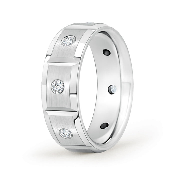 Made in platinum with 8 gypsy-set round diamonds totaling 1/3 carats. Diamonds are G color, VS2 clarity. Band features satin finish with polished beveled edges.