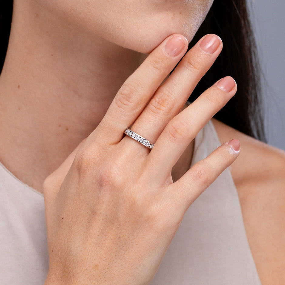 This Channel-Set Diamond Eternity Wedding Ring by Angara shimmers with round diamonds channel set around a platinum band. The full eternity design symbolizes never-ending love with classic sophistication and lasting brilliance.