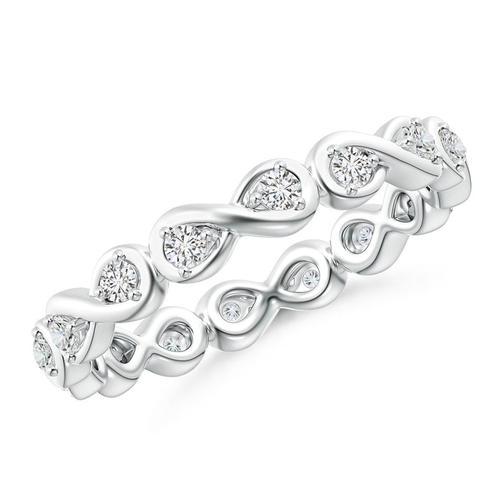 This Prong Set Round Diamond Infinity Knot Wedding Ring by Angara is a celebration of eternal love and unity. The 18K white gold eternity band features a series of delicate infinity knots, each accented with brilliant round diamonds that add subtle sparkle and elegance, perfect for symbolizing lifelong commitment with a glamorous touch.