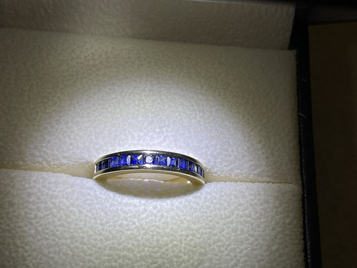 Handcrafted in 14k yellow gold with eleven AAAA quality heated square sapphires approximately 2.4mm each. Total carat weight 1.04 cts. Channel setting.