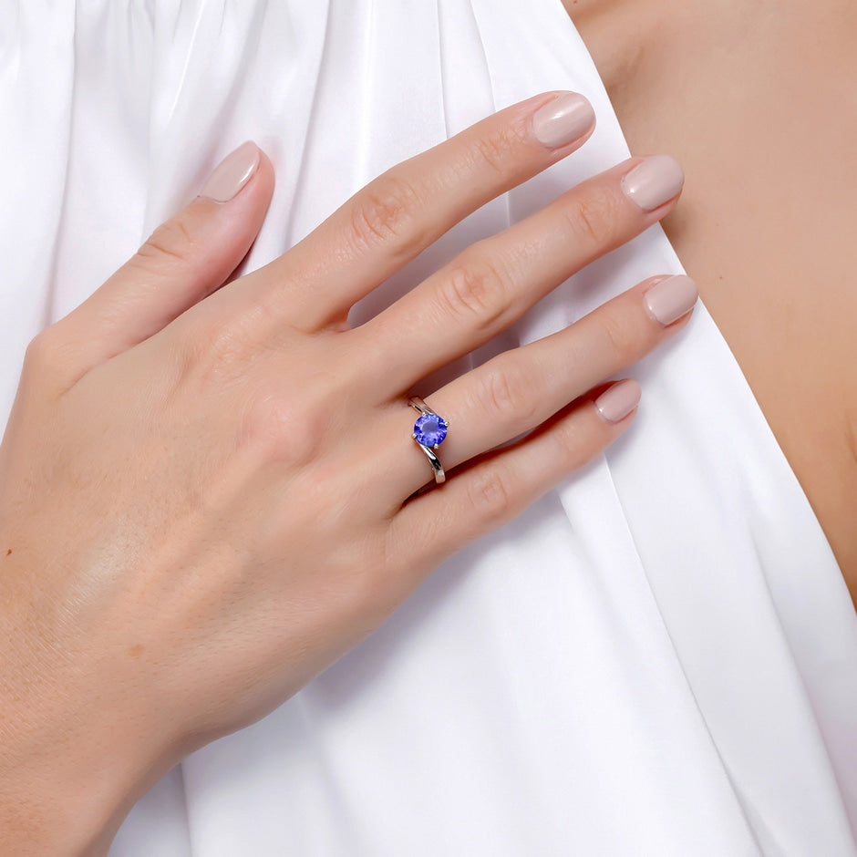 This Classic Round Tanzanite Solitaire Bypass Ring by Angara embodies timeless elegance. The AAAA quality round heated tanzanite is prong set on a lustrous 14k white gold band with a graceful bypass shank, highlighting the gem’s enchanting bluish-purple hues.