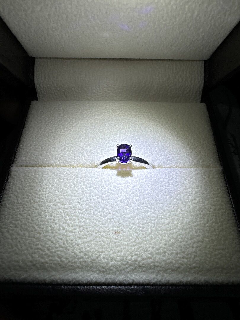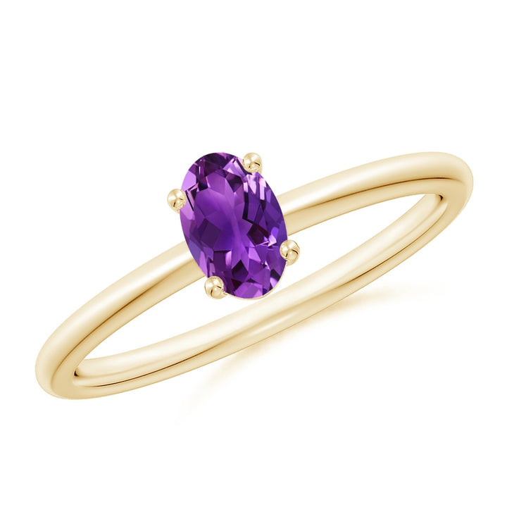 This Classic Solitaire Oval Amethyst Promise Ring by Angara is a testament to understated elegance, featuring a velvety purple oval amethyst mounted in a four-prong setting on a sleek 18k yellow gold band. The AAAA-grade amethyst sparkles beautifully, symbolizing peace and sincerity—perfect as a meaningful promise ring or a statement accessory.