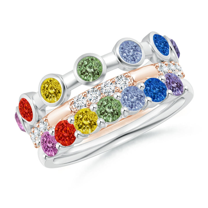The Spectra Multi-Sapphire and Diamond Stackable Ring Set by Angara offers a vibrant and colorful statement. This set features an exquisite mix of round multi-colored sapphires and sparkling diamonds, all set in a sophisticated combination of 14k white and rose gold, perfect for layering or wearing alone for bold style.