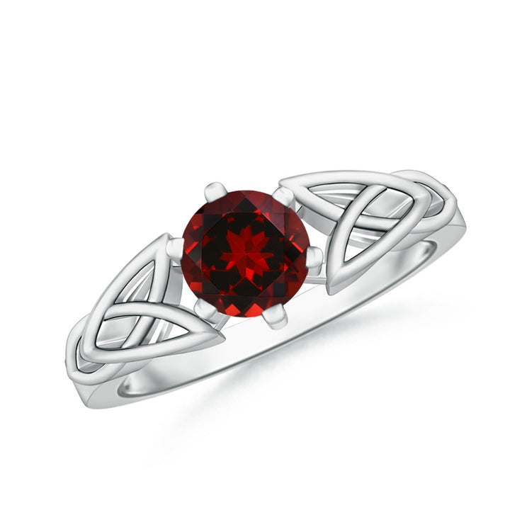 This Solitaire Round Garnet Celtic Knot Ring by Angara exudes timeless charm and intricate artistry. A rich round garnet is held securely in a six-prong setting, while the band features a beautifully carved Celtic knot design symbolizing eternity and unity. Crafted in 18k white gold, this ring blends classic elegance with meaningful symbolism, perfect for a refined yet personal statement.