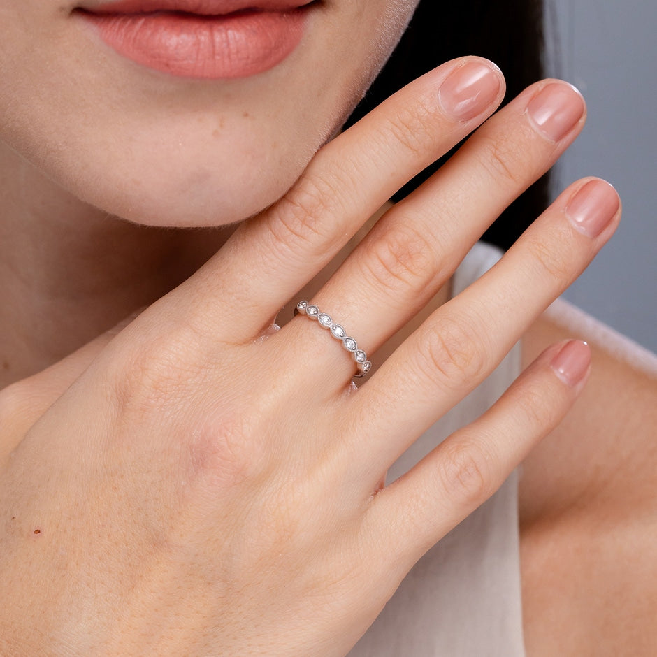 This Pave Set Round Diamond Milgrain Wedding Ring by Angara is a vintage-inspired treasure with marquise-shaped frames linked in a linear pattern. Each frame is embellished with shimmering round diamonds, while delicate milgrain detailing along the edges adds subtle texture and depth. Sculpted in 18k yellow gold, this half eternity band offers elegant sparkle and timeless charm.