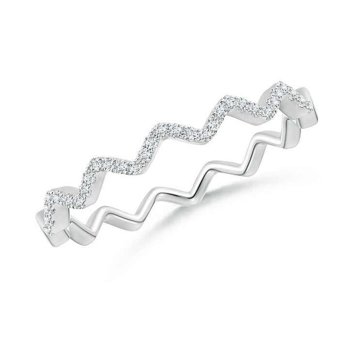 This Classic Round Diamond Zig Zag Ring by Angara is a sophisticated half eternity band crafted in 18k white gold, featuring a modern zig zag pattern. Encrusted with 31 round diamonds in an intricate U pavé setting, this ring offers a distinctive design that balances contemporary edge with timeless sparkle.