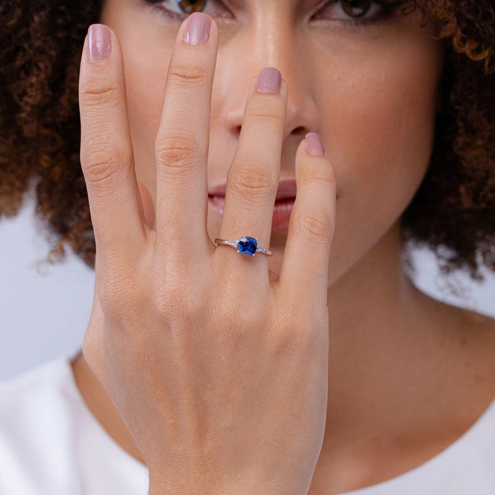 Cushion Sapphire Ring with Bar-Set Tapered Baguette Diamonds