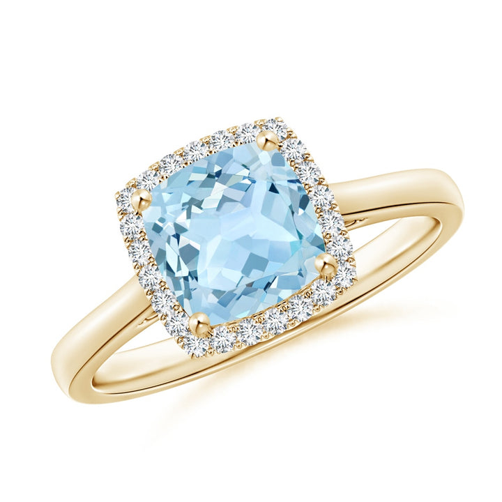 This Classic Cushion Aquamarine Halo Engagement Ring by Angara captures timeless romance. A heated cushion-cut aquamarine is prong set at its center, framed by a brilliant pave halo of round diamonds on a 14k yellow gold band. This ring embodies serene beauty and refined glamour for the modern bride.