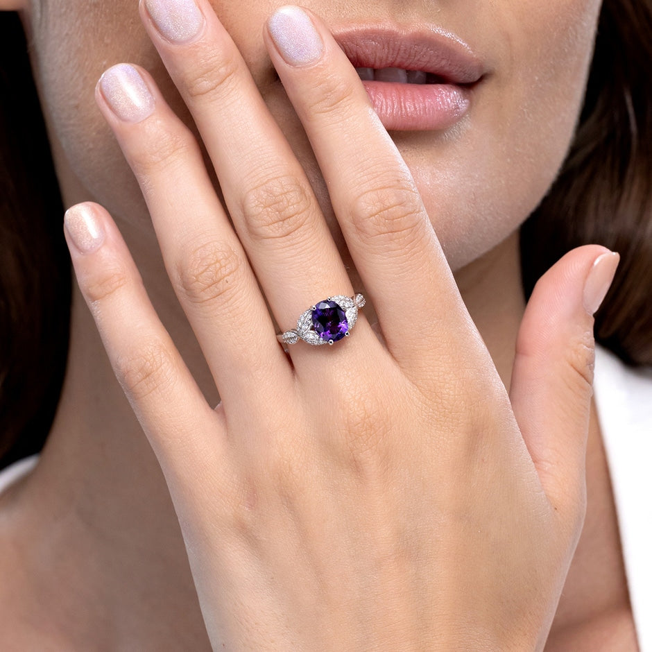 This Amethyst and Diamond Trillium Petal Flower Ring by Angara embodies natural elegance with its design inspired by the delicate trillium blossom. The oval royal purple amethyst forms the centerpiece, prong set to showcase its luminous depth. Surrounding pavé diamonds trace the contours of the 14k yellow gold shank, offering dazzling sparkle from every angle. Symbolizing beauty and renewal, this ring is a refined heirloom-quality piece that stands out as a statement ring or a meaningful gift. Ideal for stacking or wearing solo.