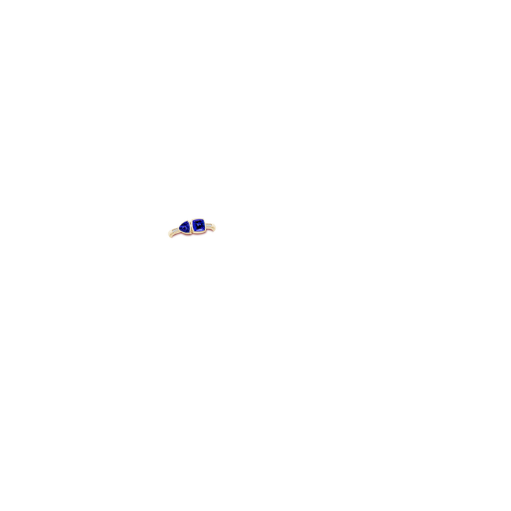 Handcrafted in 14k yellow gold with diamond accents. One cushion-cut tanzanite, approx. 5mm, 0.80 ct, AAAA grade, heated, bezel-set. One trillion-cut tanzanite, approx. 5mm, 0.40 ct, AAAA grade, heated, bezel-set. Diamond pavé accents on shank. Ring size 6.5.