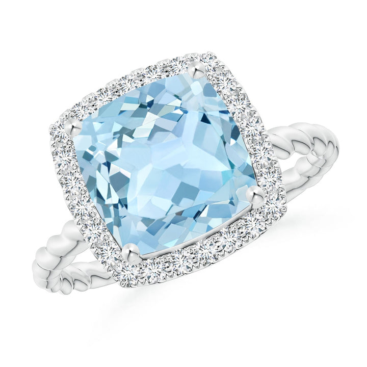 This Cushion Aquamarine Twist Shank Halo Cocktail Ring by Angara is designed for making a dazzling statement. Featuring a cushion-cut aquamarine that radiates an icy blue glow, the gem is prong-set on a stylish twisted 14k white gold shank. A halo of pavé diamonds surrounds the center stone, enhancing its vibrancy and adding luxurious sparkle. Ideal for glamorous evenings and bold style moments.