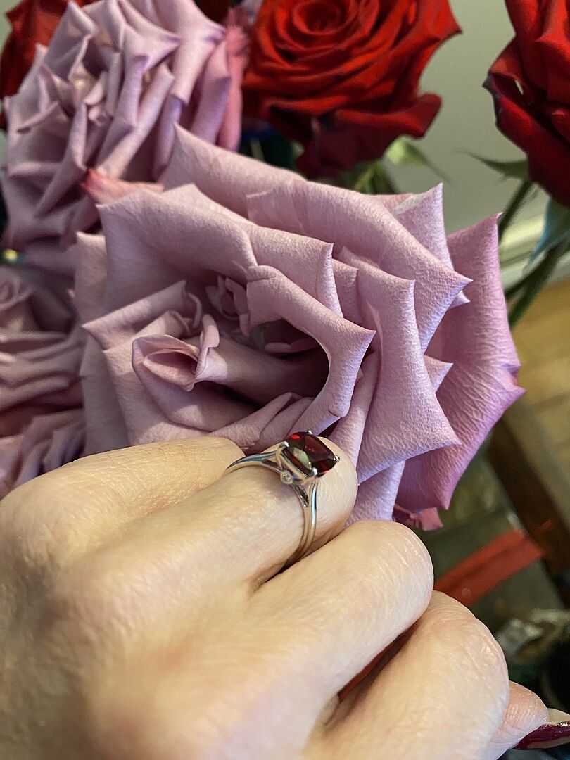 This Classic Cushion Garnet Solitaire Ring by Angara showcases the same luxurious design as its counterpart but crafted in 18k rose gold, offering a warm and romantic glow. The intense red garnet takes center stage, framed by delicate diamond accents on the gallery for an understated sparkle. A perfect heirloom-quality ring for those who love a blend of classic and contemporary elegance.