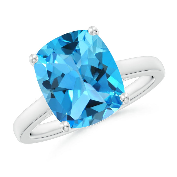 This Classic Cushion Swiss Blue Topaz Solitaire Ring with Hidden Accents by Angara presents a vibrant cushion-cut Swiss blue topaz set in 14K white gold with subtle diamond accents on the gallery. The heated and irradiated topaz radiates a captivating blue hue, while the hidden diamonds add delicate sparkle, combining bold color with understated elegance.