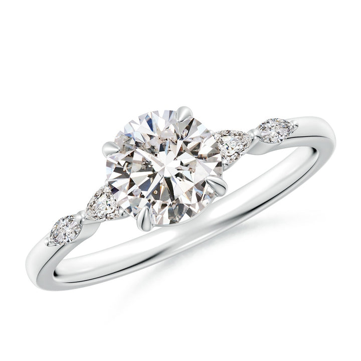 This Claw-Set Round Diamond Side Stone Engagement Ring by Angara features a prong-set round center diamond framed by pear and marquise diamond accents on the shank. Crafted in platinum, this elegant design symbolizes commitment with refined brilliance and an intricate silhouette, perfect for those seeking timeless luxury.