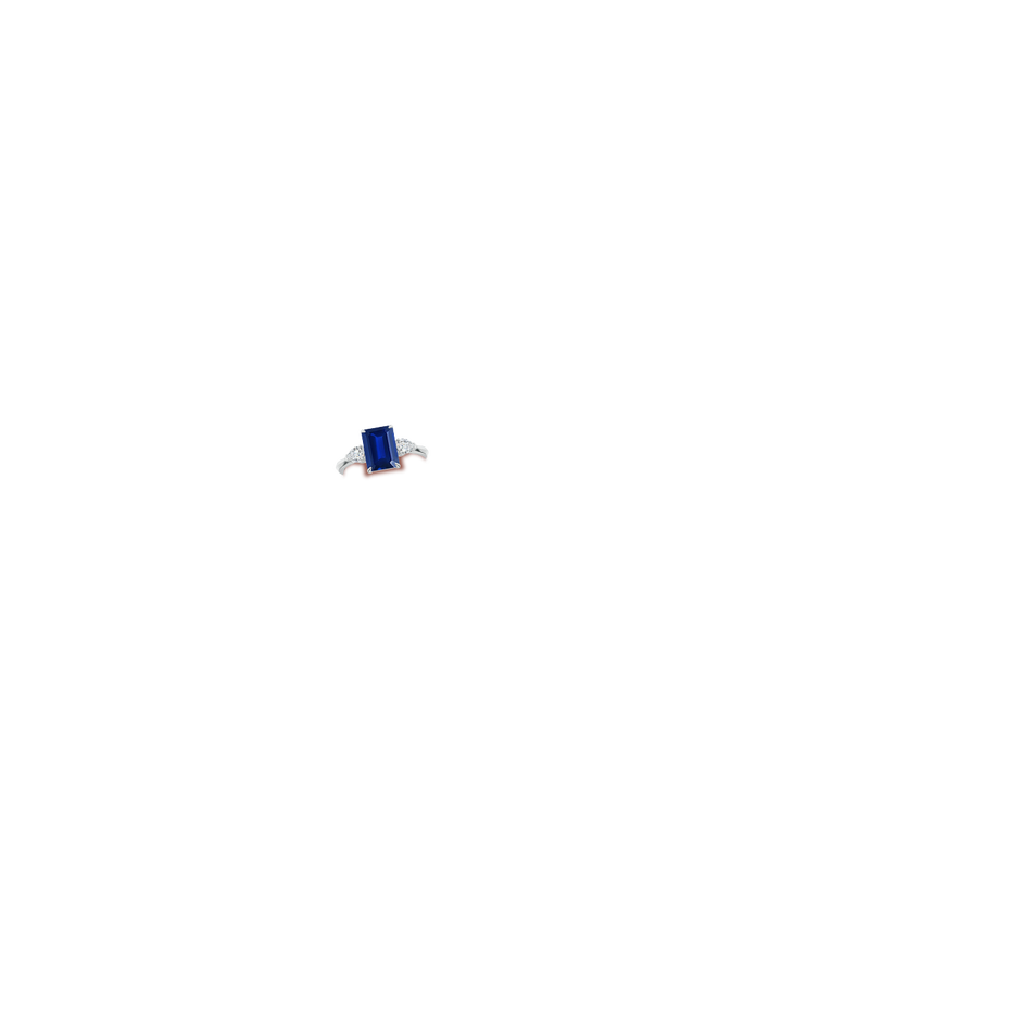 Crafted in 18k white gold. Features 1 emerald-cut lab-grown blue sapphire (approx. 9x7mm, 2.45 ct) prong set with 2 pear-shaped lab-grown diamonds (F-G VS quality, 0.36 ct total). Total carat weight approx. 2.81 cts.