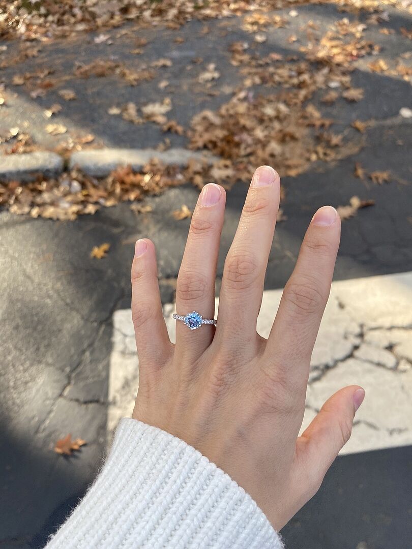 This Aquamarine Solitaire Engagement Ring with Diamond Accents by Angara is a breathtaking expression of refined beauty and timeless romance. At its heart, a brilliant round aquamarine glows with a cool, serene blue, securely held in a classic six-prong setting that elevates the stone’s radiance. The polished shank is gracefully lined with brilliant diamond accents in a U pave setting, symbolizing clarity and commitment, making this ring a perfect choice for your most special moment. Its elegant simplicity combined with luxurious sparkle creates a stunning engagement ring that balances tradition with modern sophistication.