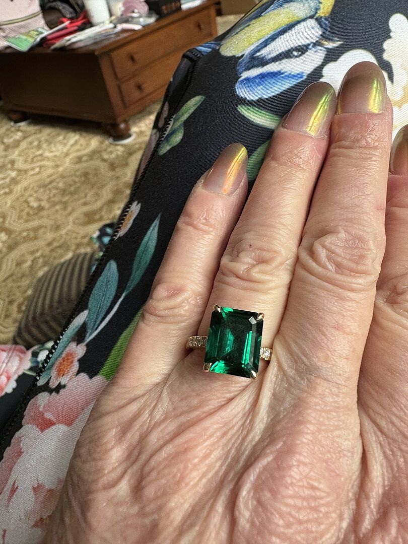 Crafted in 14k white gold. Features 1 lab-grown emerald-cut blue sapphire approximately 12x10mm (5.50 ct) prong set. Accented with 14 round F-G VS lab-grown diamonds totaling 0.29 ct in U-pave setting on the shank.