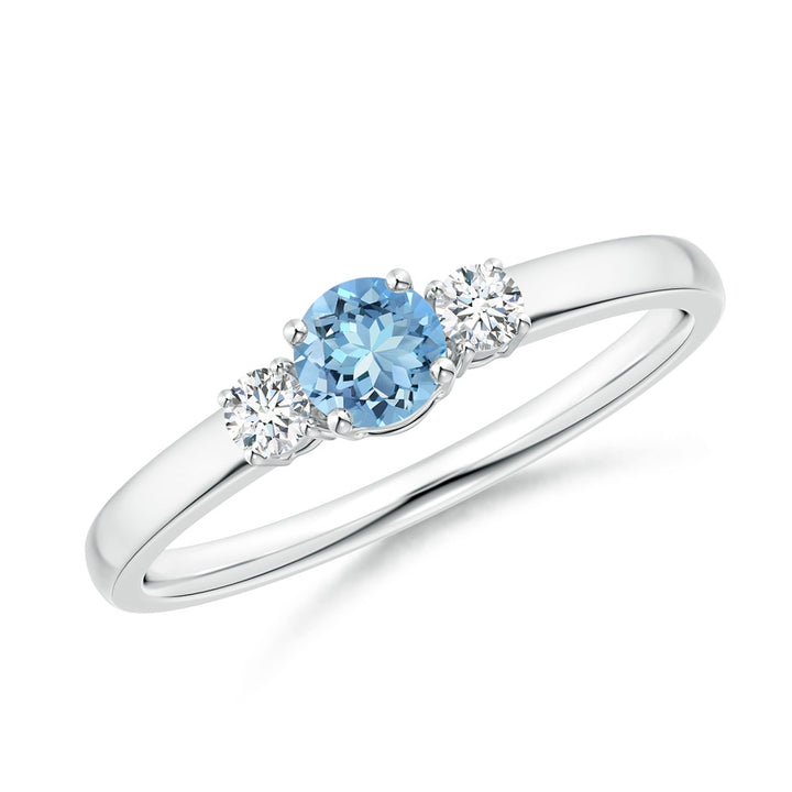 This Classic Round Aquamarine and Diamond Three Stone Engagement Ring by Angara features a serene round aquamarine flanked by two shimmering round diamonds, symbolizing the past, present, and future of your love story. The platinum setting enhances the icy blue brilliance of the aquamarine, making this ring an elegant and meaningful choice for engagements or special occasions.