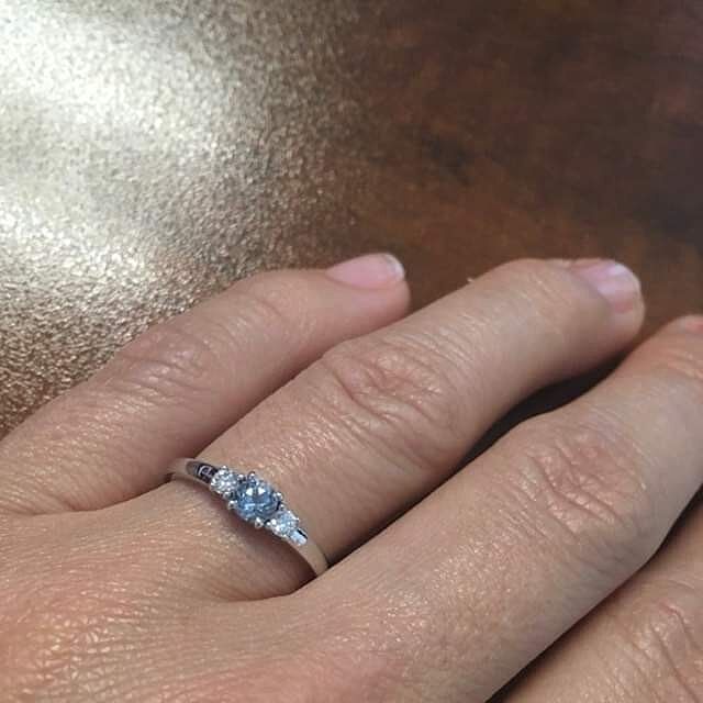 Crafted in platinum. Set with 1 round aquamarine (4mm, approx. 0.20 cts, AAAA quality, heated) and 2 round brilliant diamonds (total approx. 0.14 cts, G-H VS quality). Prong settings.