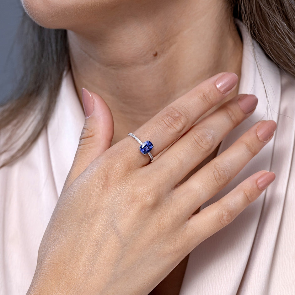 Thin Shank Cushion Cut Tanzanite Ring With Diamond Accents