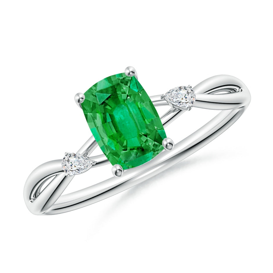 This Nature Inspired Cushion Rectangular Emerald Side Stone Engagement Ring by Angara evokes the beauty of nature with its prong-set cushion rectangular emerald centerpiece flanked by pear-shaped diamonds. The twisted 14k white gold shank adds an organic flow to the design, symbolizing growth and harmony — a dreamy choice for those who cherish unique elegance.