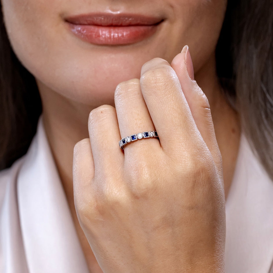Handcrafted in 14k white gold featuring seven bezel-set square blue sapphires measuring approximately 2mm each with a total carat weight of 0.39 carats (AAAA quality, heated enhancement). Accented by eight bezel-set round diamonds totaling 0.28 carats (G-H VS quality).