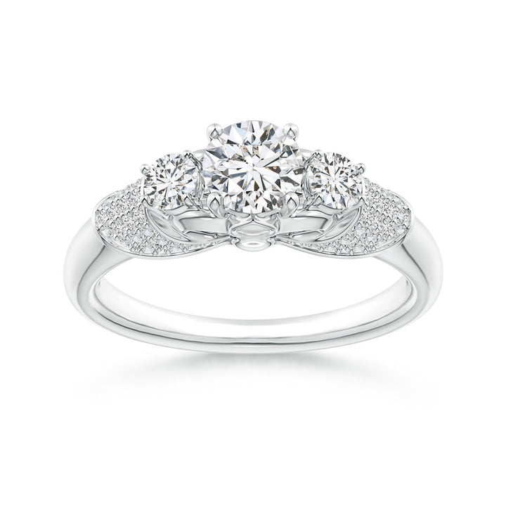 This Three Stone Round Diamond Fleur De Lis Engagement Ring by Angara is a dreamlike symbol of everlasting love. Set in 14k white gold, the three round diamonds represent past, present, and future, while the pavé diamond accents cascade gracefully along the ribbon shank and sides, creating dazzling sparkle from every angle. The fleur de lis motif adds a regal and timeless allure, perfect for an elegant engagement.