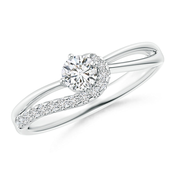 This Solitaire Round Diamond Swirl Promise Ring by Angara is a refined expression of elegance and commitment. Featuring a prong-set round center diamond that captures light with brilliant fire, it is gracefully embraced by a swirling cascade of diamond accents set in an intricate U pavé style. The dainty split shank crafted in 14k white gold elevates the design’s sophistication, creating a harmonious balance of sparkle and delicate structure. This ring is perfect for those seeking a timeless, luxurious piece that symbolizes promise and devotion with modern flair.