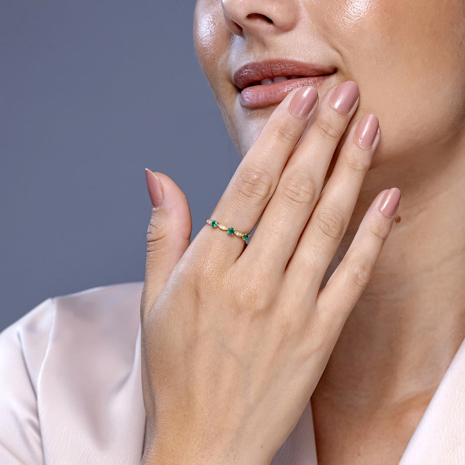 Handcrafted in 18k yellow gold. Features 3 round emeralds (0.45 ct total approx., 3.5mm, AAAA quality, oiled) and 8 round diamonds (0.05 ct total, G-H VS quality). Prong and pavé settings with milgrain detailing.