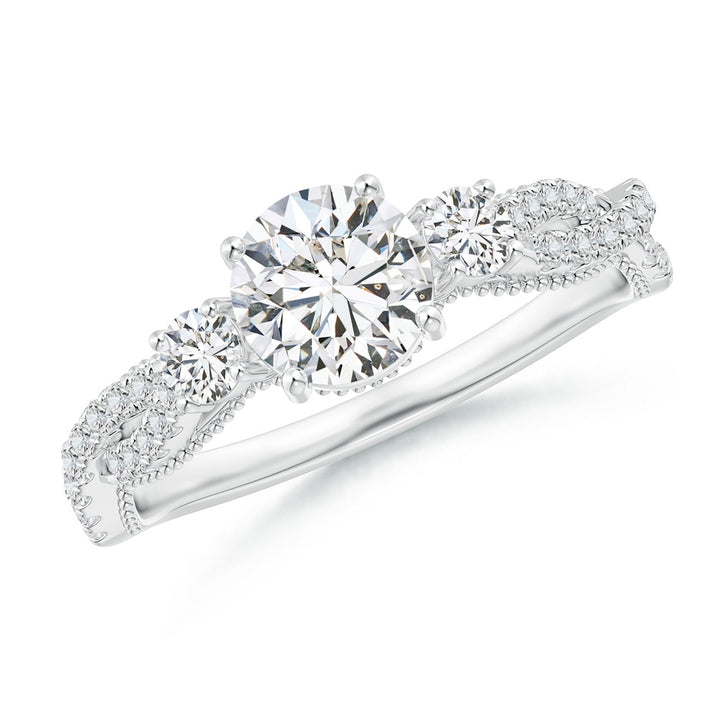 This Aeon Vintage Inspired Three Stone Diamond Criss Cross Shank Engagement Ring by Angara beautifully symbolizes the past, present, and future of love. Three round brilliant diamonds are prong-set atop a meticulously detailed criss-cross shank adorned with pavé diamonds and milgrain accents, creating an exquisite vintage aesthetic. A hidden diamond accent adds a secret sparkle visible only up close, enhancing its luxurious allure. Crafted in 14k white gold, it’s designed for those who cherish timeless romance with intricate craftsmanship.