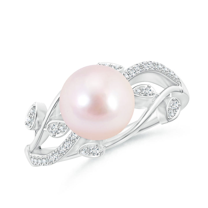 This Japanese Akoya Pearl Olive Leaf Vine Ring by Angara celebrates nature’s harmony through exquisite design. The 8mm Akoya cultured pearl rests amid a split shank adorned with sparkling prong-set diamonds and detailed olive leaf motifs, symbolizing peace and growth. Set in 14k white gold, this ring is a delicate balance of organic inspiration and refined craftsmanship—ideal for lovers of nature and elegance alike.