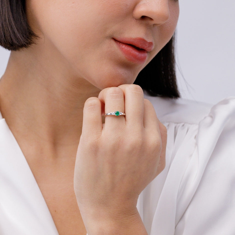 Classic Round Emerald and Diamond Three Stone Engagement Ring