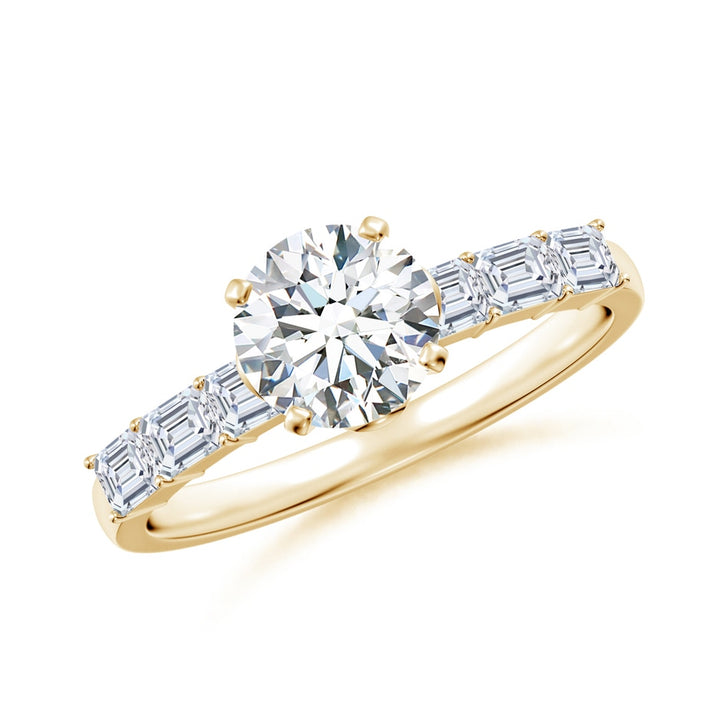 This Prong-Set Round Lab-Grown Diamond Engagement Ring with Emerald-Cut Accents by Angara delivers a captivating brilliance that promises an instant yes. The centerpiece is a stunning round lab-grown diamond set on a 14k yellow gold shank, accented by six emerald-cut lab-grown diamonds that add architectural elegance. Floral cutwork on the gallery and bezel-set diamond accents infuse delicate artistry and surprise detail, making this ring a dazzling blend of modern design and timeless romance.