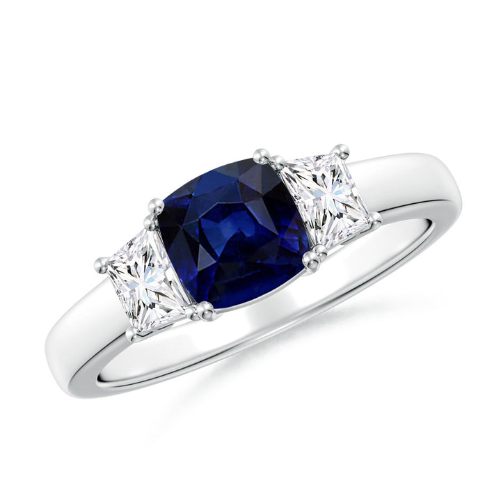 Classic Cushion Blue Sapphire and Trapezoid Diamond Three Stone Engagement Ring