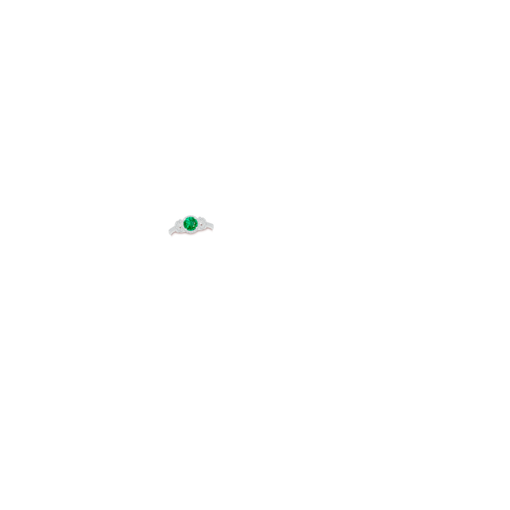 Handcrafted in 18k white gold featuring one AAA-quality round emerald (6mm, 0.75 ct) with oiling enhancement, prong set. Accented with 46 round diamonds (total 0.25 ct, H SI2 grade) in bezel, pavé, and prong settings.
