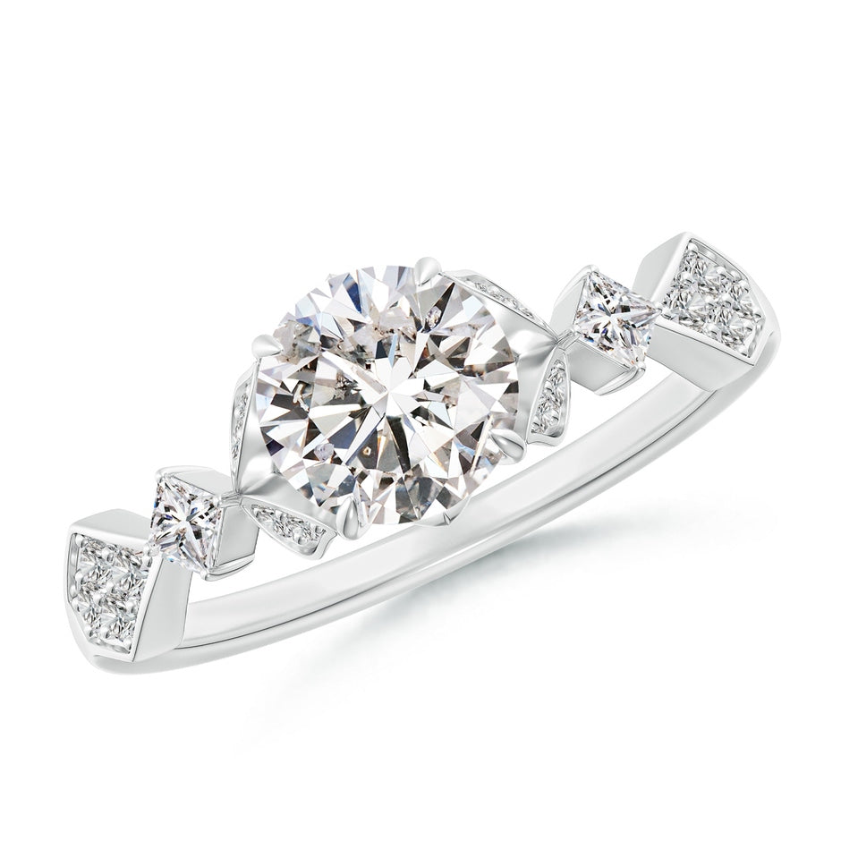 Handcrafted in platinum featuring one round diamond (1 ct, I-J I1-I2 grade), prong set. Accented by two princess-cut diamonds (total 0.10 ct, I-J I1-I2 grade), prong set. Additional diamond accents on the shank.