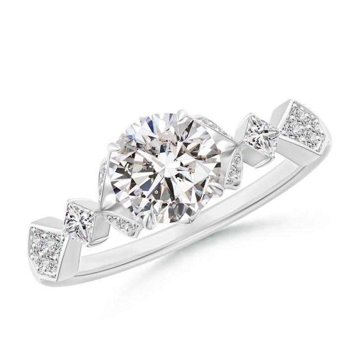 This Vintage Style Round Diamond Engagement Ring with Leaf Motifs by Angara is a stunning celebration of nature and sparkle. A brilliant round diamond takes center stage, flanked by glittering leaf-shaped motifs that are enhanced with princess-cut diamonds on each side. Additional diamond accents embellish the shank, completing the luxurious look of this platinum ring. Its vintage-inspired design with fine craftsmanship makes it an irresistible choice for those seeking elegance with a natural touch.