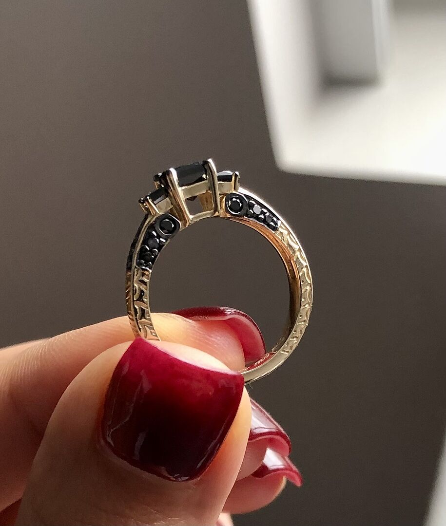 This Princess-Cut Enhanced Black Diamond Three Stone Ring by Angara is a striking symbol of a relationship’s journey, crafted in 14k yellow gold. The centerpiece features one large princess-cut enhanced black diamond flanked by two smaller princess-cut black diamonds, all prong set. The intricate metalwork and accent diamonds add depth and texture, creating a captivating and unique statement ring full of mysterious allure.