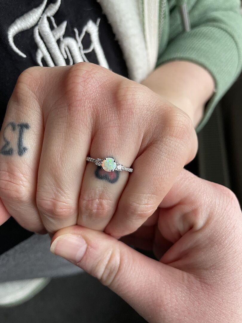 Classic Three Stone Round Opal and Diamond Engagement Ring