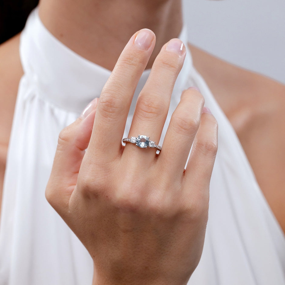 Classic Three Stone Round Aquamarine and Diamond Engagement Ring