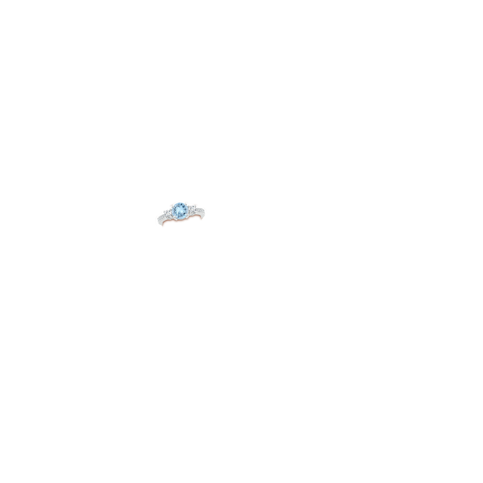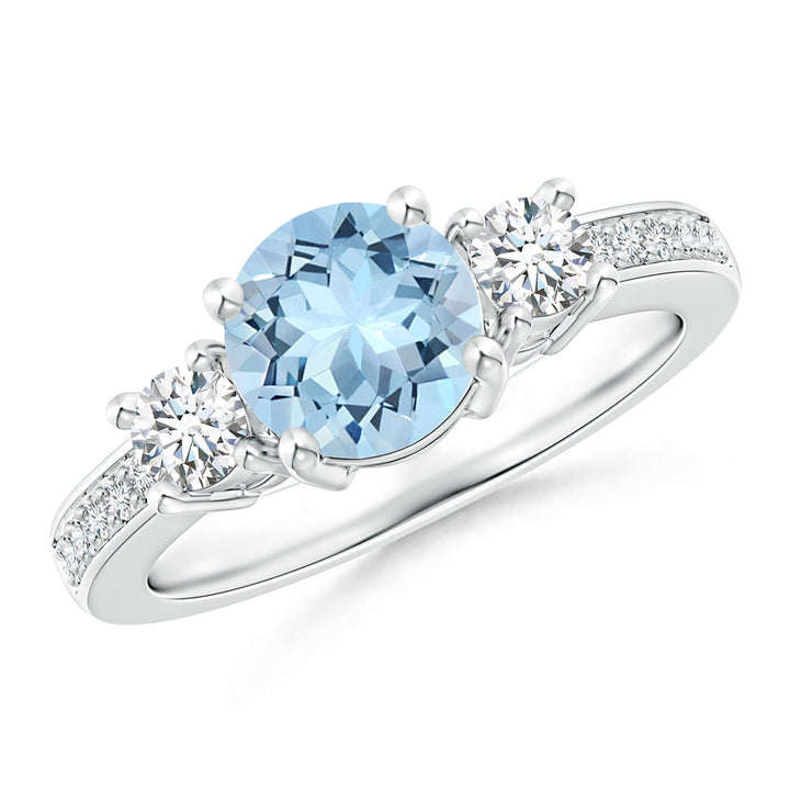 This Classic Three Stone Round Aquamarine and Diamond Engagement Ring by Angara shines with icy blue brilliance. The prong-set 7mm heated round aquamarine center stone is enhanced by two white diamonds and pavé diamond accents on the shank. Crafted in 14K white gold, this elegant ring symbolizes a beautiful journey through past, present, and future with radiant sophistication.