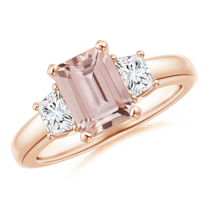 Crafted in 14k rose gold. Features 1 emerald-cut morganite (approx. 8x6 mm, 1.40 ct, AAA quality, heated and irradiated) flanked by 2 trapezoid diamonds totaling 0.32 ct (H SI2 quality). All stones set with prongs.