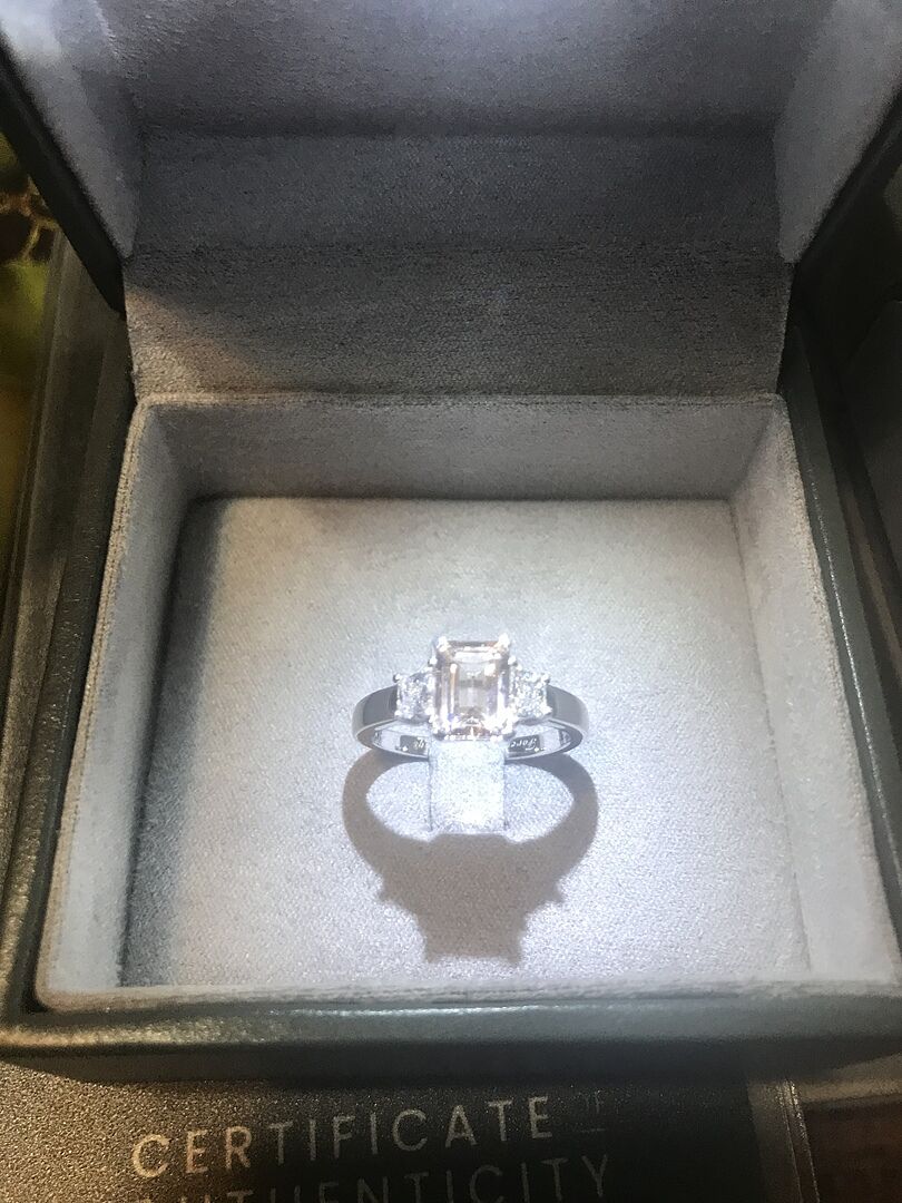 Emerald-Cut Morganite and Trapezoid Diamond Three Stone Ring