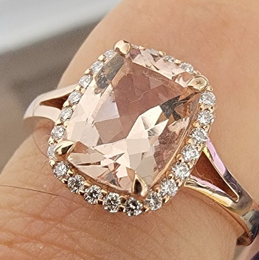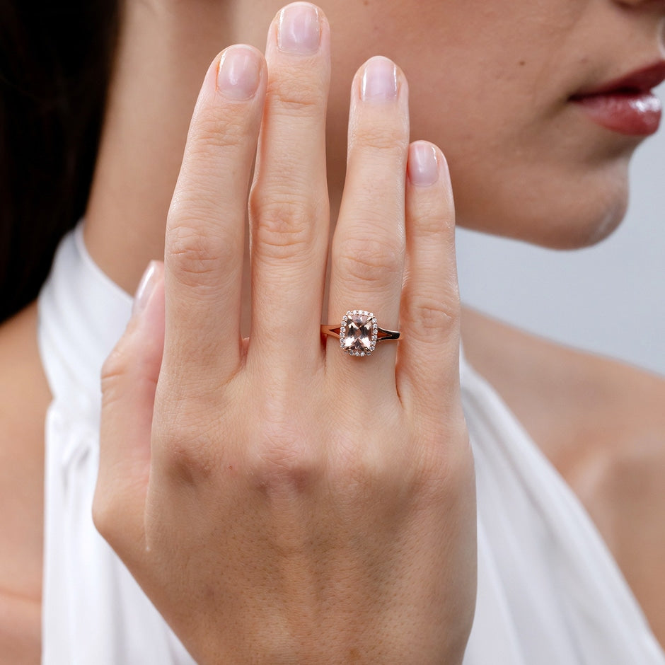 Claw-Set Cushion Morganite Halo Split Shank Ring